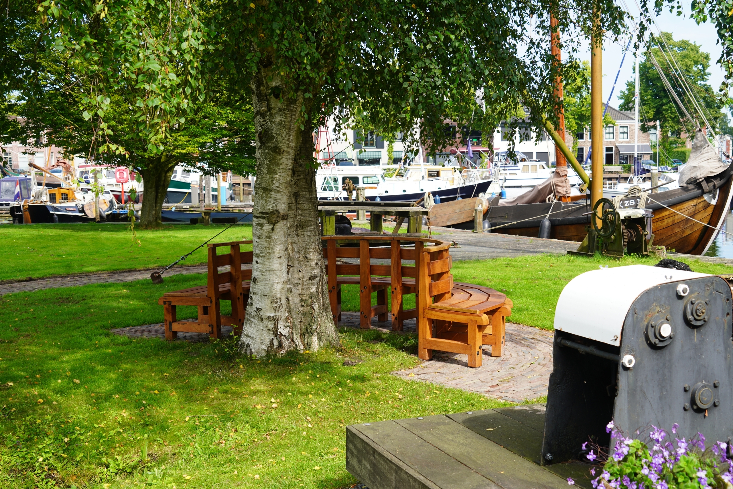 De authentieke boombank is geplaatst rondom de grote berk op het eerste eilandje voor het Botterhuus. De bank werd gemaakt van een grote eikenboom uit Zwartewaterland die gekapt moest worden.