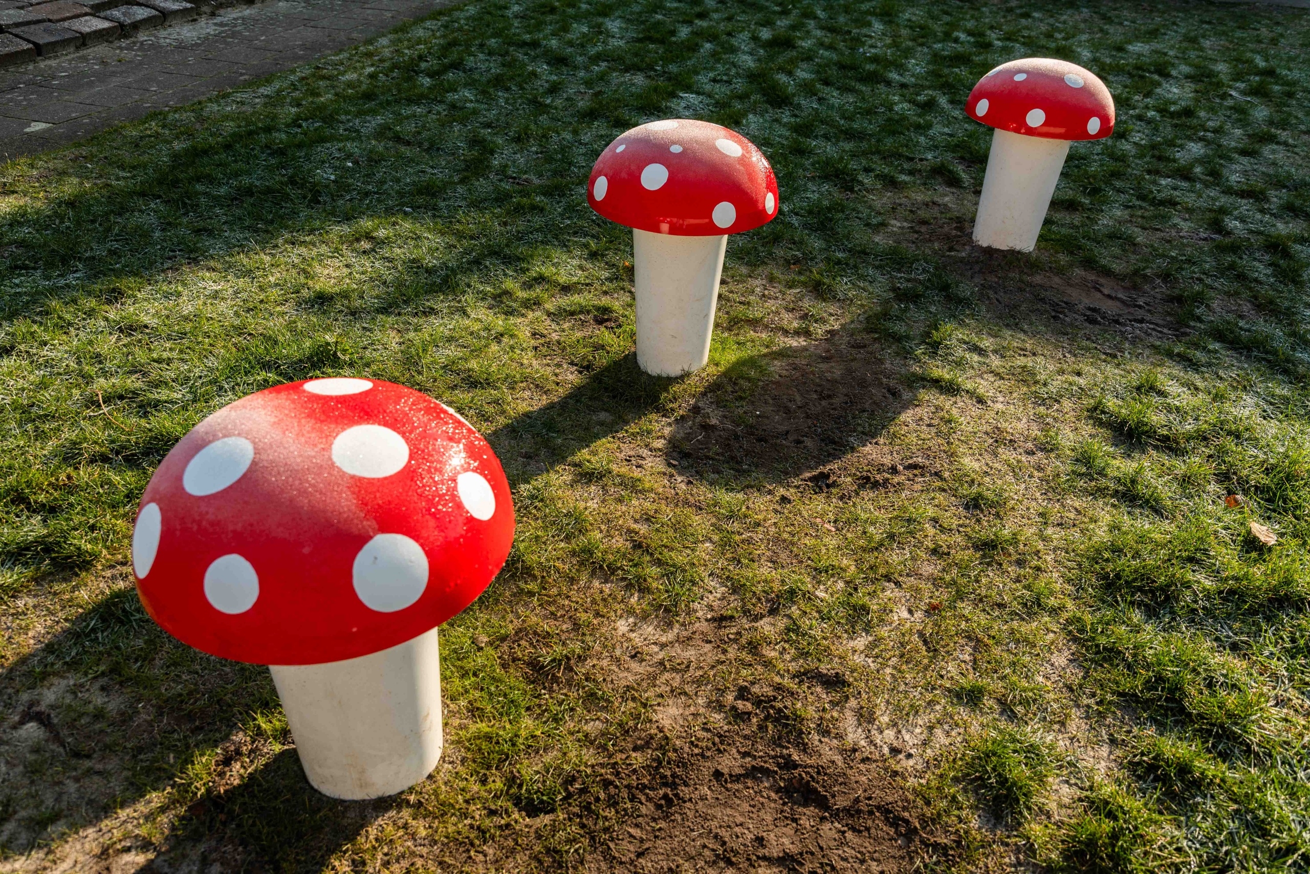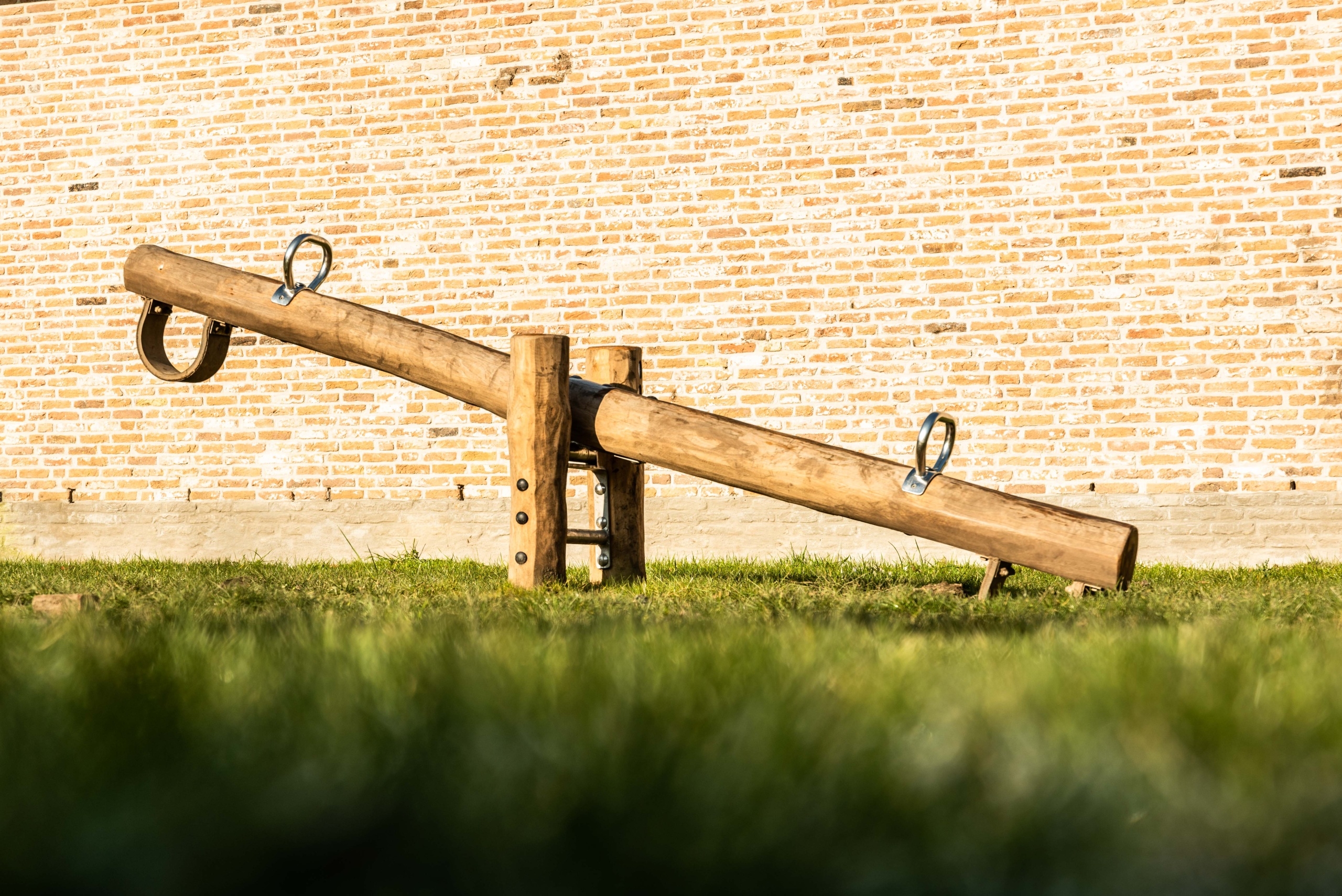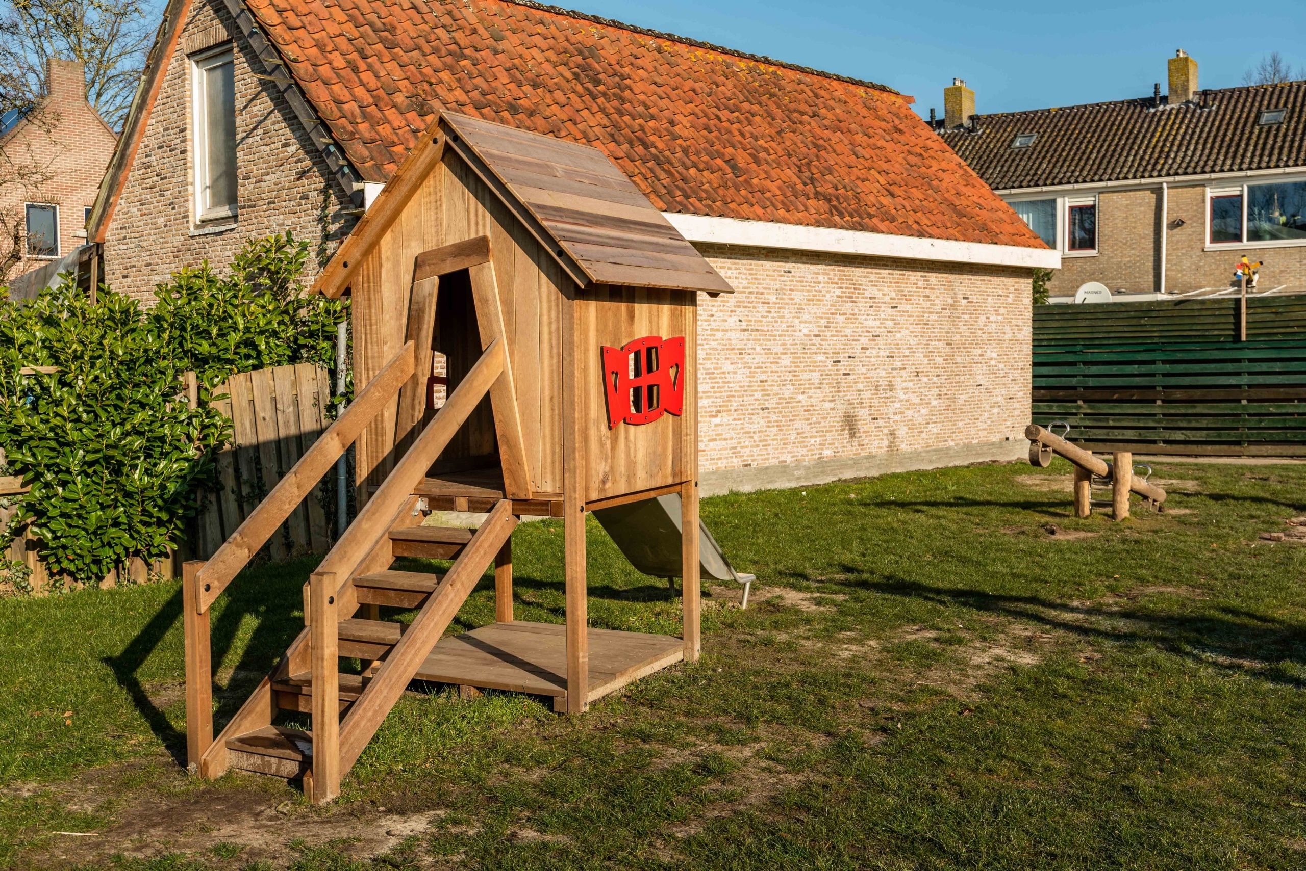 Het grasveld is behoorlijk opgehoogd en ingezaaid. De speeltuin heeft een natuurlijke uitstraling gekregen door de houten speeltoestellen.